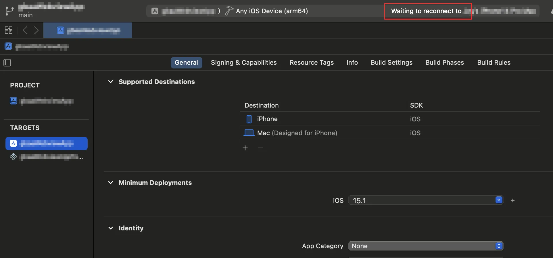 Xcode에서 "Waiting to reconnect to [디바이스 이름]"이라는 메시지는 디바이스와의 연결이 끊어졌거나, 디바이스가 정상적으로 인식되지 않을 때 나타나는 오류입니다. 위 이미지와 같이 Xcode에 "Waiting to reconnect to [디바이스 이름]" 메시지가 계속해서 보이며, 디바이스로 Run을 해볼 수 없는 상태가 됩니다.